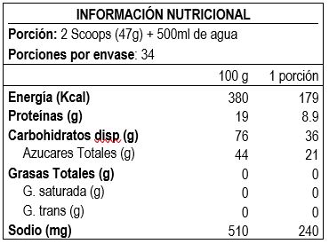 Ingredientes: Maltodextrina, Sacarosa 24%, Aislado de Proteína de Suero 20% (Leche), Fructosa 16%, Aromatizantes Naturales, Ácidos Alimentarios (Ácido Málico), Reguladores de la Acidez (Citratos de Sodio, Citrato de Potasio), Cloruro de Sodio, Emulsionante (Lecitina de Soja)